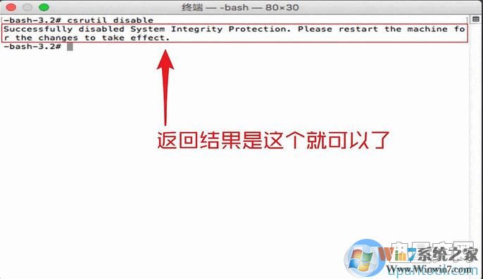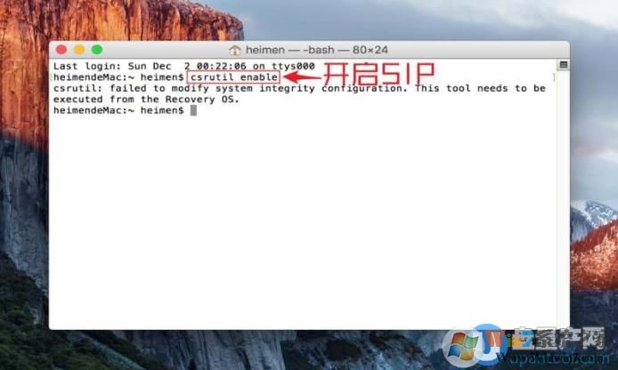 7、如需重启开启SIP,在Mac OS终端内输入命令:csrutil enable 然后回车,这样就成功开启了。