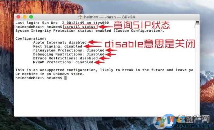 6、查询SIP状态,在终端内输入命令:csrutil status 然后回车