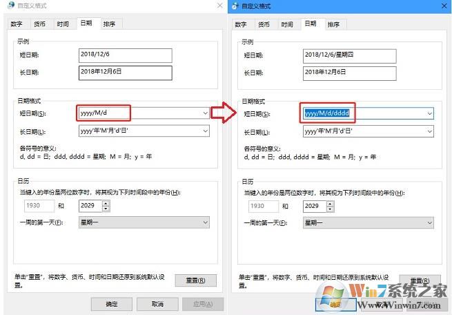 4、在弹出的自定义格式设置中,切换到【日期】选项卡,然后将“日期格式”下方的【短日期】格式中的 yyyy/M/d/ 改成:yyyy/M/d/dddd,相当于后面多加了个星期显示选项,完成后,点击下面的“确定”保存,如图所示。