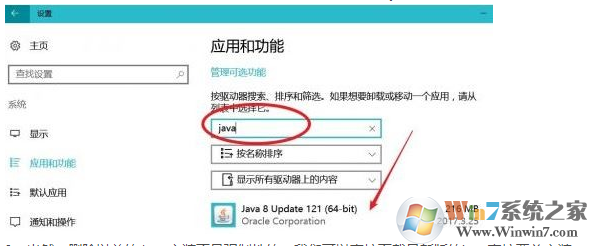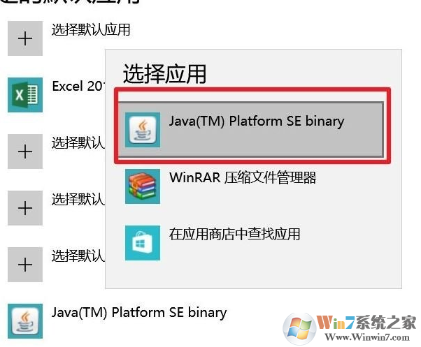 2、点击左侧的【默认应用】,在右侧查看计算机中是否以安装java,如果有的话,选中将其卸载掉;