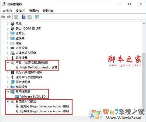 2、打开设备管理器分别展开【声音、视频和游戏控制器 】和【显示适配器】、【音频输入和输出】查看是否有 ↓ 的箭头,若有的话在对应设备上单击右键,选择【启用】;如图所示: