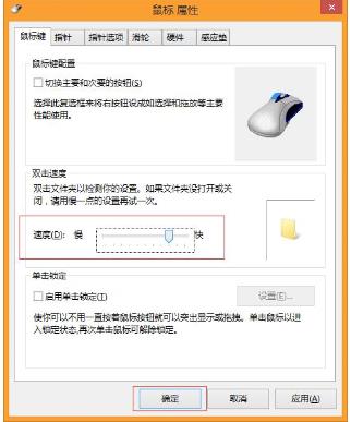 第三步:更改双击速度,调节至用户更习惯的速度,拖动速度选项到一个合适的位置,并点击确定。