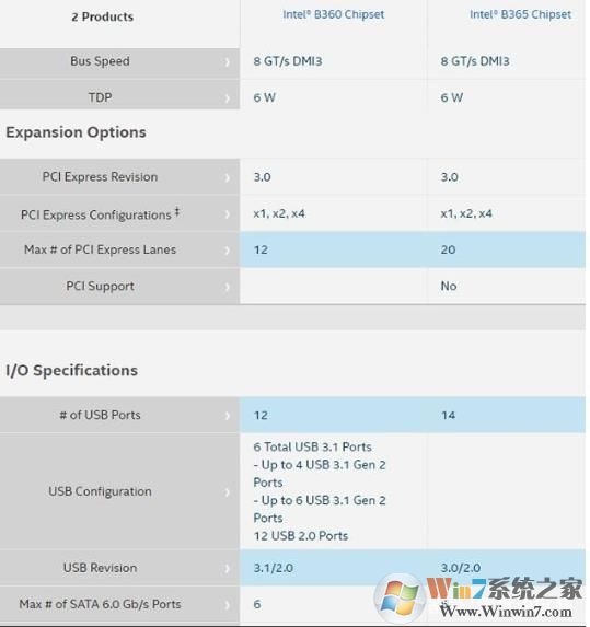 2018年英特尔推出300系列芯片组,包括Z390、B360、H370、H310等,使用的是14nm工艺。而之前老版Z370是Z270的马甲,使用的是22nm工艺。大家都知道H310芯片组已经出了22nm工艺的H310C,各电商平台都可以购买到,此芯片组是办公一族标配。B365芯片组是H310C之后的又一次升级更新,最新平台配合B365芯片组可以全面支持win7系统。B365芯片组的规格没什么大变化,TDP功耗同样是6W,支持8GT/s的DMI3总线,支持双通道内存,B365的PCIe通道从12条增加到20条,没有原生UBS 3.1 Gen2接口,支持14个USB 3.0/2.0接口,与B360芯片组参数基本一致,可以认为是B360芯片组的马甲产品,工艺是22nm