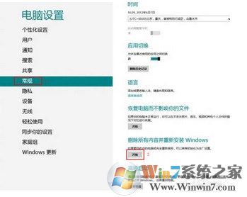 2、选择“常规”,在“删除所有内容并重新安全Windows”目录下点击“开始”。