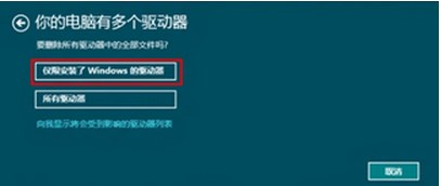 4、在弹出的“你的电脑有多个驱动器”弹窗里可以选择“仅限安装了Windows的驱动器”或者“所有驱动器”来确定初始化范围。这次选的是“仅限安装了Windows的驱动器”,这个选项将会把C盘数据初始化。