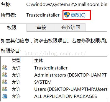2、出现所有者界面,我们点击所有者那里同,可以看到所有者为trustedinstaller,我们点击更改;
