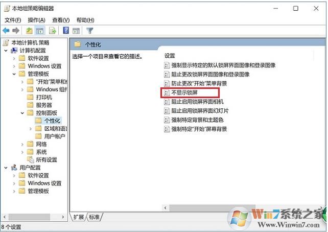 2、之后就可以打开Win10组策略操作面板,然后在左侧依次展开 计算机配置 -> 管理模板 -> 控制面板 -> 个性化,然后在右侧双击“不显示锁屏”,如下图所示。