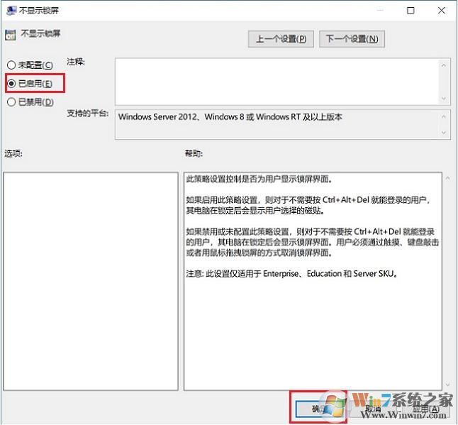 3、打开不显示锁屏的配置页面,默认的“未配置”选择为“已启动”,并点击下方的“确定”保存设置,如下图所示。