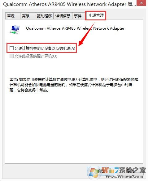3、将"允许计算机关闭此设备以节约电源"前面的勾去掉,然后点击确定即可。