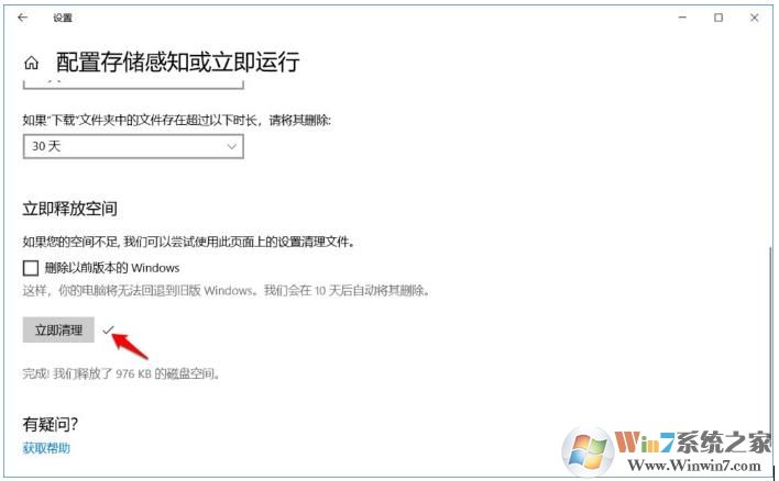 注意:【立即释放空间】下有一项 删除以前版本的Windows ,如果不是空间不足而引起系统运行受阻,则最好别点击打勾,因为清理了以前版本的Windows后,如果更新的版本出现不稳定现象,电脑将无法退回到旧版本 Windows。且系统将在10天后自动删除旧版本的Windows(即:Windows.old文件)。