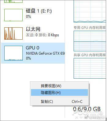 2、然后“性能”标签左侧右击然后选择“隐藏图形”;