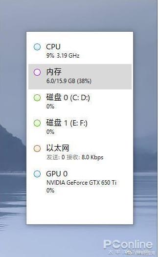 开启了Win10监测小面板之后,我们就不需要安装额外的软件也能实时查看Win10系弘的CPU、内存、硬盘、GPU、网络使用率了。