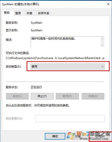 3、把sysmain服务启动类型设置为禁用,然后点击应用保存