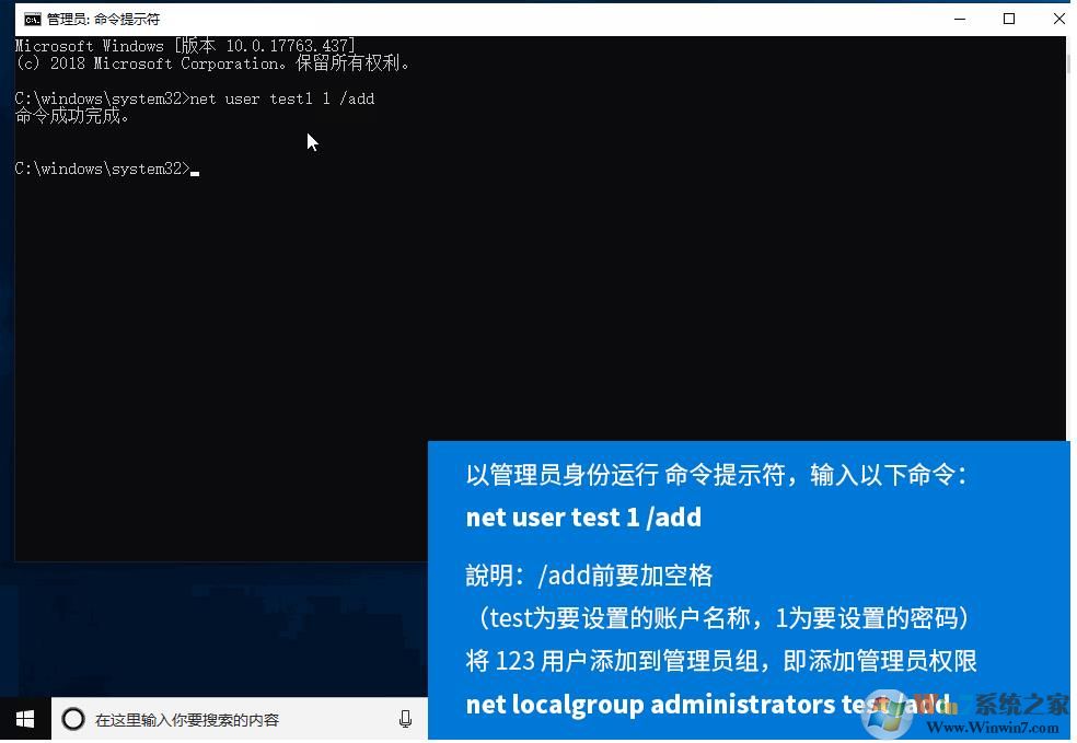 3、然后再输入 net localgroup administrator test /add