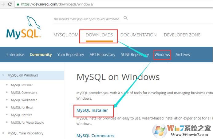 mysql下载地址:https://dev.mysql.com/downloads   在Downloads下的Windows—— Mysql installer 点击