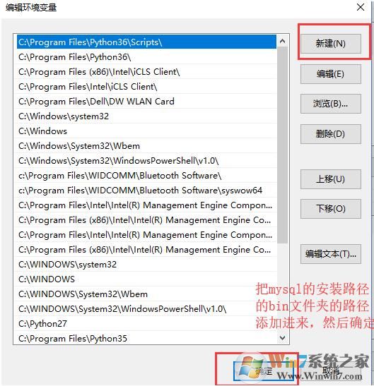 4、点击新建,然后把mySQL的安装,路径的bin文件夹路径添加进去。也就是C:\Program Files\MySQL\MySQL Server 5.7\bin  确定;
