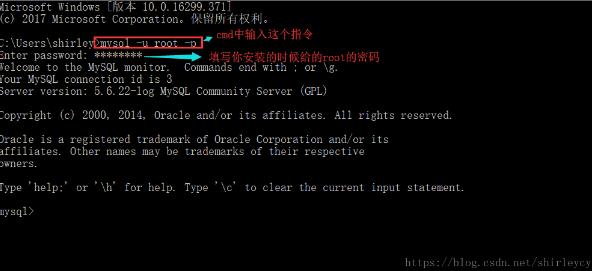 5、最后测试一下,打开cmd,输入mysql -u root -p,并回车,如果出现Welcome字样,说明mysql安装成功。