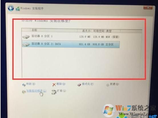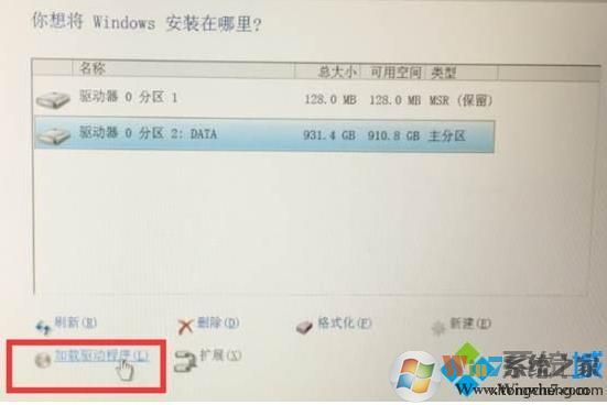 2、在安装系统的选择磁盘界面,选择“加载驱动程序”;