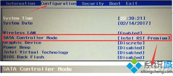 1、在安装系统前,进入电脑的BIOS界面(联想笔记本电脑:开机后立刻连续敲击F2键或者关机后通过novo小孔选择BIOS Setup),选择到Configuration页面,将SATA Controller Mode选项中的Intel RST Premium,改成AHCI。