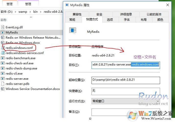4、右键点击MyRedis——属性,然后在目标属性外,添加并指定读取的配置文件redis.windows.conf,前面要加空格(如)
