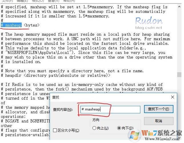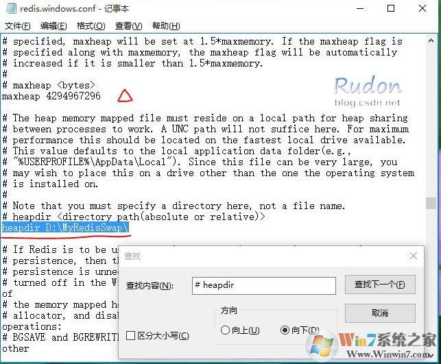 5、修改redis.windows.conf,在文件对应位置 添加两个设置:maxheap 4294967296 和 heapdir D:\MyRedisSwap\  (见图示)