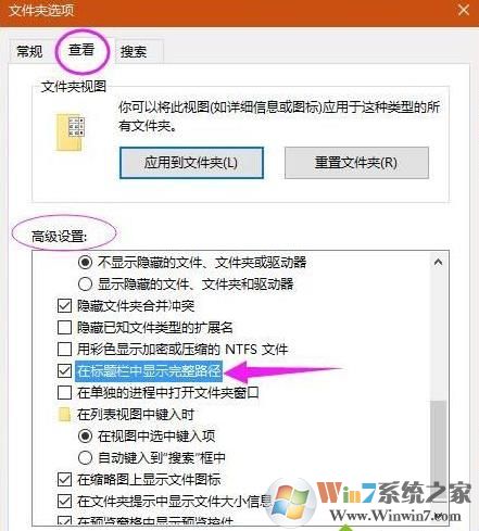 2、在弹出的“文件夹选项”设置窗口中,我们从“常规”切换到“查看”选项卡,然后在高级设置栏中,勾选“在标题栏中显示完整路径 ”,点击确定按钮;
