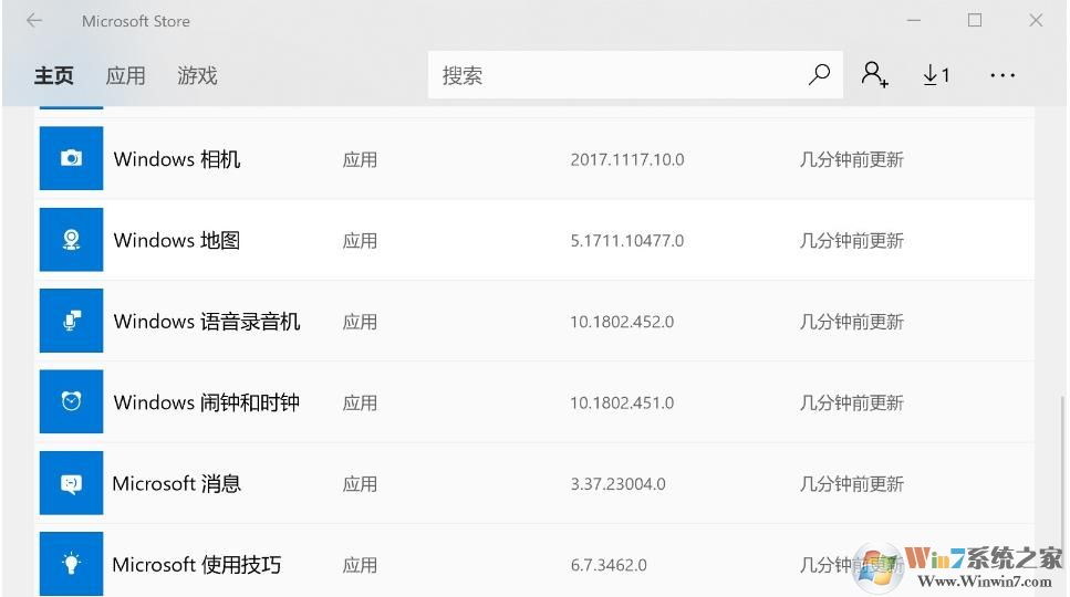 3.这一步更改其他自带应用文字。进入商城,点击页面右上角的 三个点“···”,选择下载和更新,再点击“获取更新”,此时会更新基本所有自带内置应用,在更新列表你可以发现,更新的内置应用名字变成了中文,截个图展示一下。