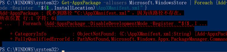 在设置-> 应用和功能 里面没有 应用商店,而且在powershell中以管理员模式执行了: