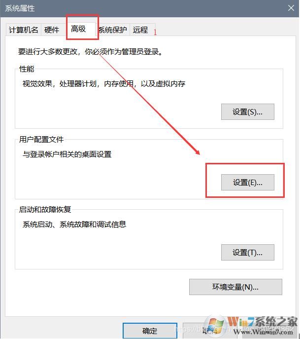 2.打开"系统保护" -> "高级" -> 选择"用户配置文件"的"设置" 按钮