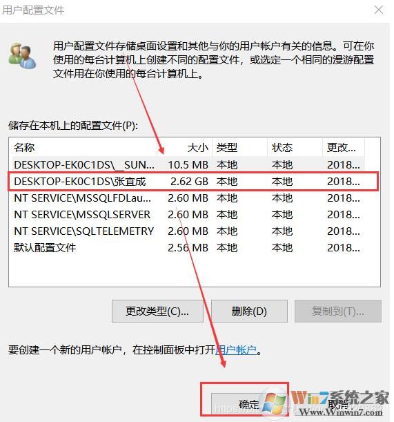 3. 在用户配置文件选项下,选择"储存在本机上的配置文件"(通常是大小最大的,你可以看看哪个眼熟来选择) -> 点击确定.