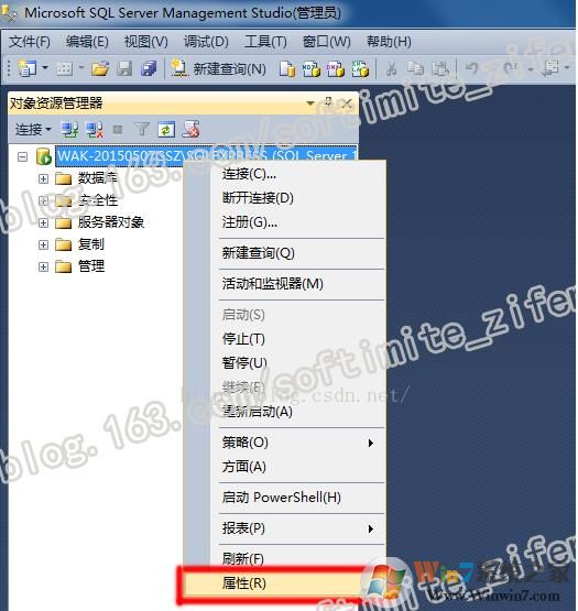 2. 在管理中,右键数据库服务器名,选择【属性】。