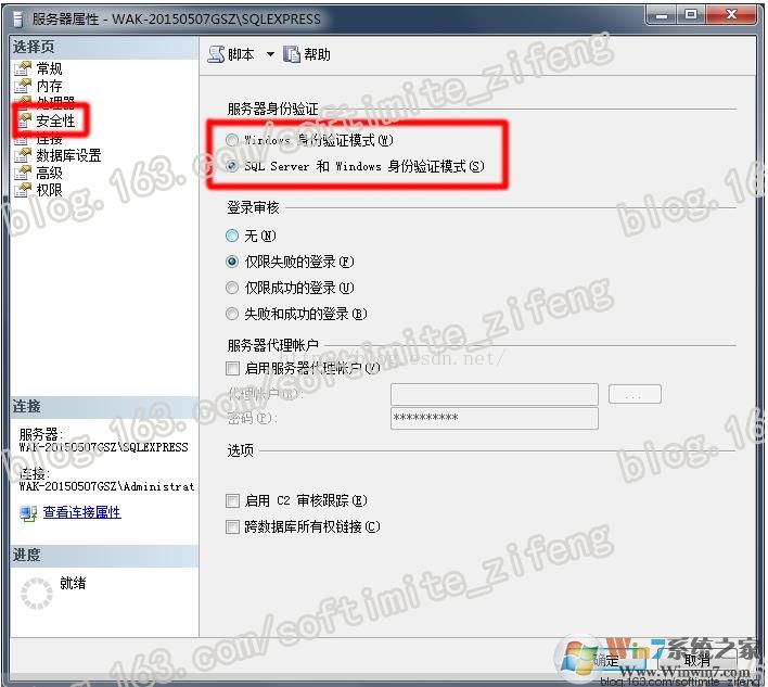 3. 打开“服务器属性”窗口,选择【安全性】,更改“服务器身份验证”,如下图所示。