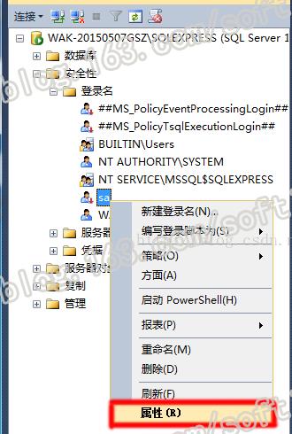 4. 展开数据库服务器名—“安全性”—“登录名”, 右键“sa”用户,选择【属性】。