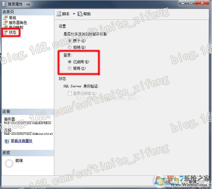 6. 仍然在“登录属性”窗口,选择【状态】,选择“登录”下面的【已启用】,如下图所示。