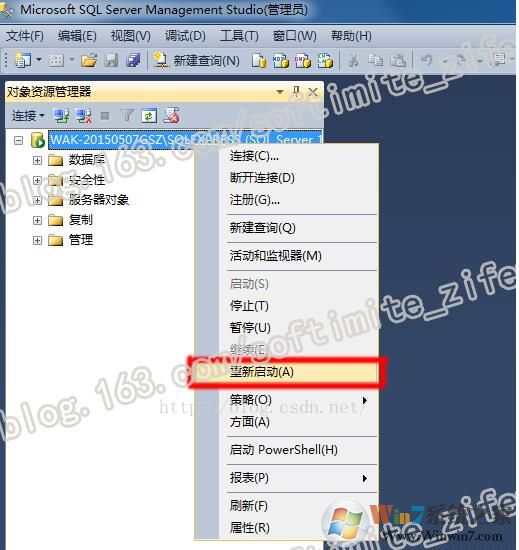 7. 右键数据库服务器名,选择【重新启动】,重启SQL Server 2014