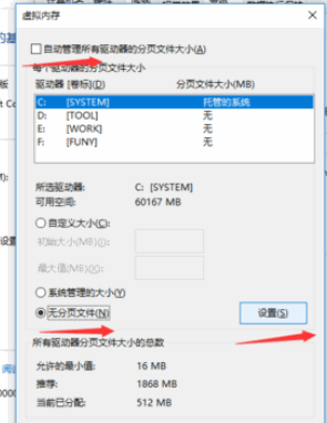 5、然后选中原来的C盘分页文件大小,如下图,选成无分页文件,然后点设置