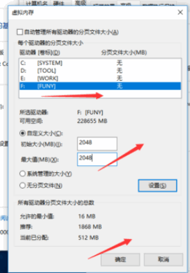 6、然后选择D盘或者其他分区,如下图选的F盘,选择后,点击自定义大小,设置跟你的内存一样大的空间,比如8G内存就填入8192,初始和最大都是填8192然后点确定就好了。