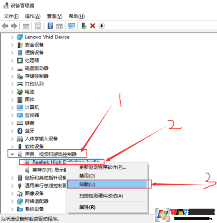 3、然后点声音、视频和游戏控制器项,如下图展开后点realtek high就是声卡驱动了,选中点鼠标右键,然后点卸载
