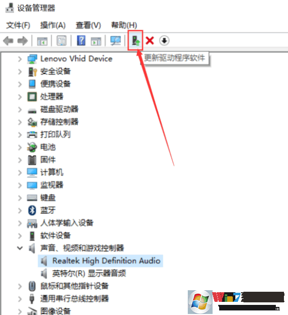 4、卸载后,我们点更新驱动程序软件,如下图这个图标点它,就会自动重新安装声卡驱动了。