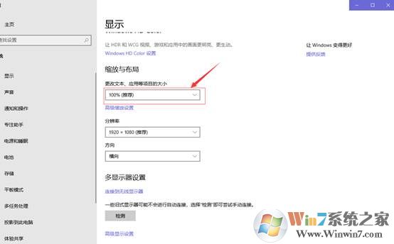 2、此时我们可以看到电脑默认125%的系统推荐绽放比。请将缩放设置改为:100或者是自定义缩放,推荐124。