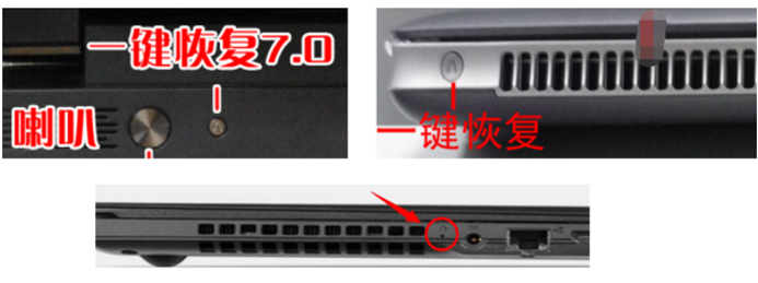 2、把制作好的U盘启动盘插入到电脑上然后(如何设置u盘启动?),如果联想笔记本电脑关机状态下按一下“一键恢复按钮”或用手机取卡针戳一下“一键恢复小孔”。一键恢复按钮位置多在“开机键旁边”或者“电脑左右侧”(可能是按钮也有可能是小孔),如下图: