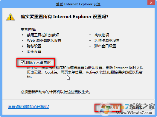 3、勾选下面的“删除个人设置”,点击“重置”;