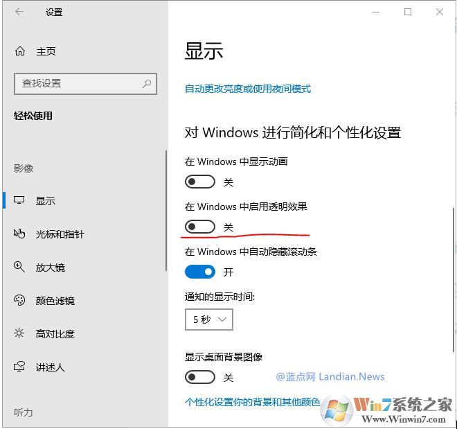 2、轻松使用-显示-在Windows中启用透明效果-关