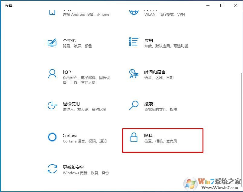 2、打开windows设置之后,我们再点击 隐私选项进入;