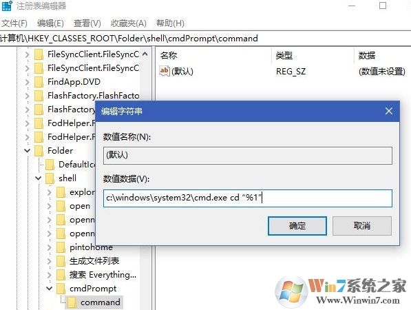 2、随后再在cmdPrompt子项下建立一个command项,将其数值数据修改为“c:\windows\system32\cmd.exe cd “%1””。修改完成后关闭注册表编辑器;