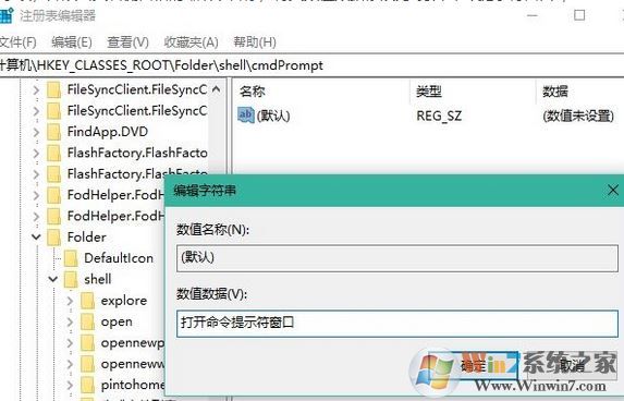 1、打开注册表编辑器并依次定位到“HKEY_CLASSES_ROOT\Folder\shell”,在shell项下新建一个cmdPrompt子项,并双击其右侧窗格的“默认”名称,将其数值数据修改为“打开命令提示符窗口”;