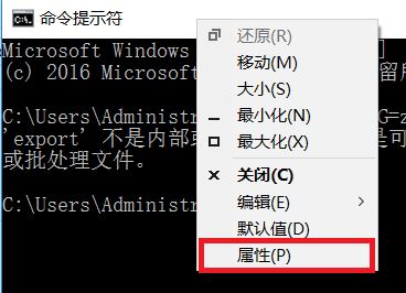 2、window的命令行界面,在顶部空白处右击,选择属性,如图:
