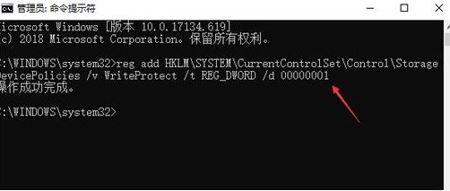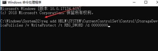 二、输入以下命令添加注册表信息:reg add HKLM\SYSTEM\CurrentControlSet\Control\StorageDevicePolicies /v WriteProtect /t REG_DWORD /d 00000000,然后回车即可。