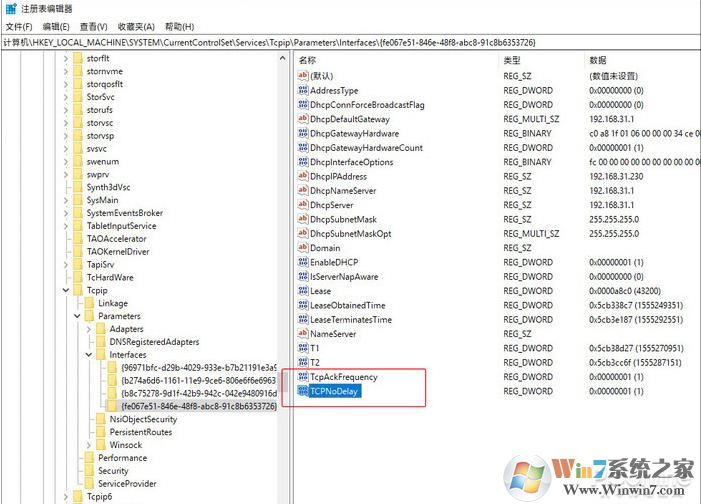 Win10并未提供Nagle的开关选项,要想关闭这一算法,需要修改注册表: