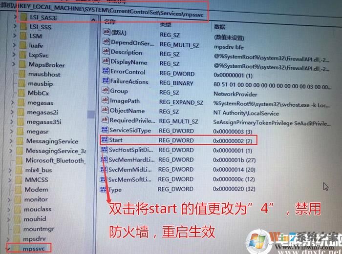 2、然后依次展开HKEY_LOCAL_MACHINE\SYSTEM\CurrentControlSet\services\mpssvc,然后找到右侧的strat将默认的2改成4,其意思是禁用该服务,更改后重启生效,如下图所示;